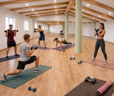Dvorana za naše korisnike nalazi se na gornjem katu, iznad igraonice. Osmišljena je kao funkcionalan i ugodan prostor za roditelje koji žele trenirati dok su im djeca sigurna i zbrinuta. Opremljena je za kružne treninge, rad na prostirkama uz korištenje utega, girija, lastika i druge funkcionalne opreme.